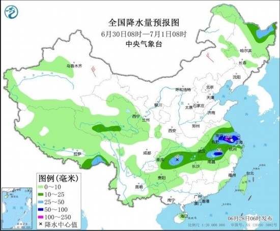 6月30日08時(shí)至7月1日08時(shí),黑龍江北部、西藏東南部、青海南部、江淮大部、江漢東部、江南北部、西南地區(qū)東部等地部分地區(qū)有中到大雨,其中,安徽中南部、江蘇南部、上海北部、江西北部等地部分地區(qū)有暴雨或大暴雨(100~150毫米)。內(nèi)蒙古中部部分地區(qū)有4~6級(jí)風(fēng),其中,新疆東部部分地區(qū)有6~7級(jí)風(fēng)(見(jiàn)圖5)。