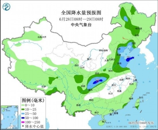 6月28日08時(shí)至29日08時(shí),內(nèi)蒙古東北部、東北地區(qū)西部、遼東半島、西北地區(qū)東南部、華北中東部、黃淮東部、江漢西部、川西高原北部、西南地區(qū)東部等地部分地區(qū)有中到大雨,其中,山東半島、湖北西部、四川盆地東北部、重慶北部等地部分地區(qū)有暴雨或大暴雨(100~140毫米)。內(nèi)蒙古東南部部分地區(qū)有4~5級(jí)風(fēng)(見(jiàn)圖3)。