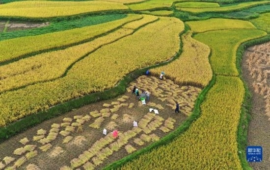9月14日,湖北省秭歸縣九畹溪鎮(zhèn)石柱村村民在田間收獲稻谷(無人機照片)。