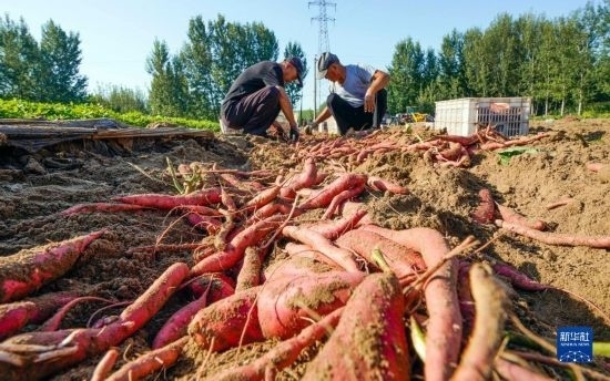 9月14日,河北省唐山市海港經(jīng)濟開發(fā)區(qū)王灘鎮(zhèn)農(nóng)民在田間收獲紅薯。