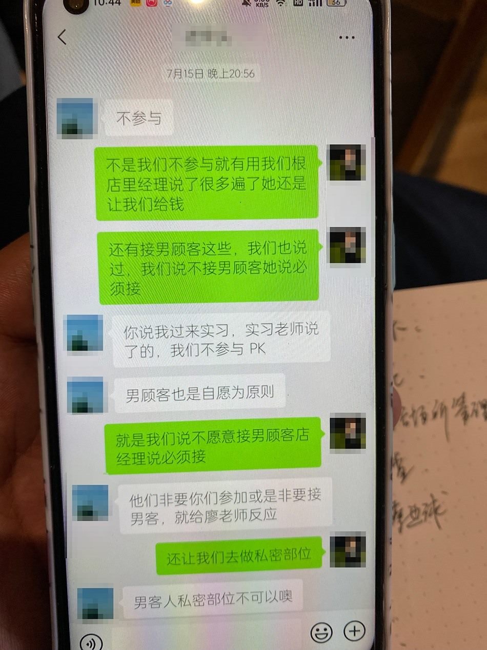 7月15日,王糖霏向班主任李老師反映門店安排他們接待男顧客事宜,并要做私密部位。李老師回復(fù)稱“男客人私密部位不可以”。