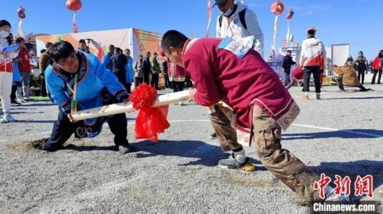 身穿民族特色服飾的赫哲族人在比拼頂杠運動。中新社記者 姜輝 攝