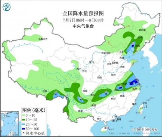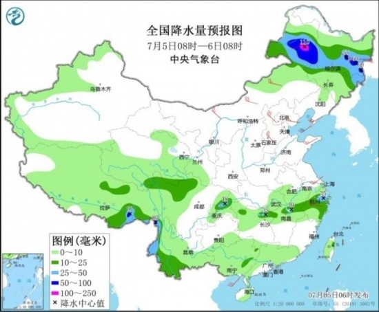 預(yù)計(jì),7月5日08時(shí)至6日08時(shí),內(nèi)蒙古東北部、黑龍江中南部以及云南西部、重慶中部、浙江北部等地部分地區(qū)有大到暴雨,其中,內(nèi)蒙古東北部局地有大暴雨(100~110毫米)。上述部分地區(qū)伴有短時(shí)強(qiáng)降水(最大小時(shí)降雨量20~50毫米,局地可超過(guò)60毫米),局地有雷暴大風(fēng)等強(qiáng)對(duì)流天氣。中央氣象臺(tái)7月5日06時(shí)繼續(xù)發(fā)布暴雨藍(lán)色預(yù)警。