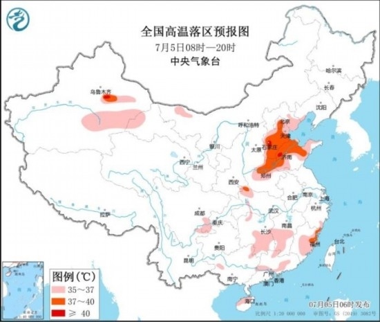 預(yù)計(jì)7月5日白天,河北中南部和東北部、北京大部、天津、山東大部、河南中北部及湖南中南部、江西中南部、福建中東部、廣東中部、新疆南疆盆地東部等地有35℃以上高溫天氣,其中,河北中南部、北京東部、天津南部、山東中北部、河南北部等地部分地區(qū)最高氣溫37~39℃,局地可達(dá)40℃以上。中央氣象臺(tái)7月5日06時(shí)繼續(xù)發(fā)布高溫黃色預(yù)警。