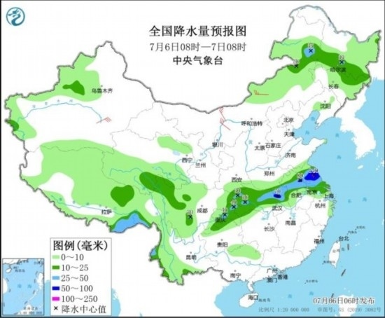 7月6日08時(shí)至7日08時(shí),內(nèi)蒙古東北部、黑龍江南部、西藏東南部和北部、青海南部、川西高原中北部、云南西部和南部、重慶大部、湖北西部和東北部、河南南部、安徽中北部、江蘇大部等地部分地區(qū)有中到大雨,其中,蘇皖中部等地部分地區(qū)有暴雨,局地大暴雨(100~140毫米);內(nèi)蒙古中東部等地有4~6級(jí)風(fēng)。