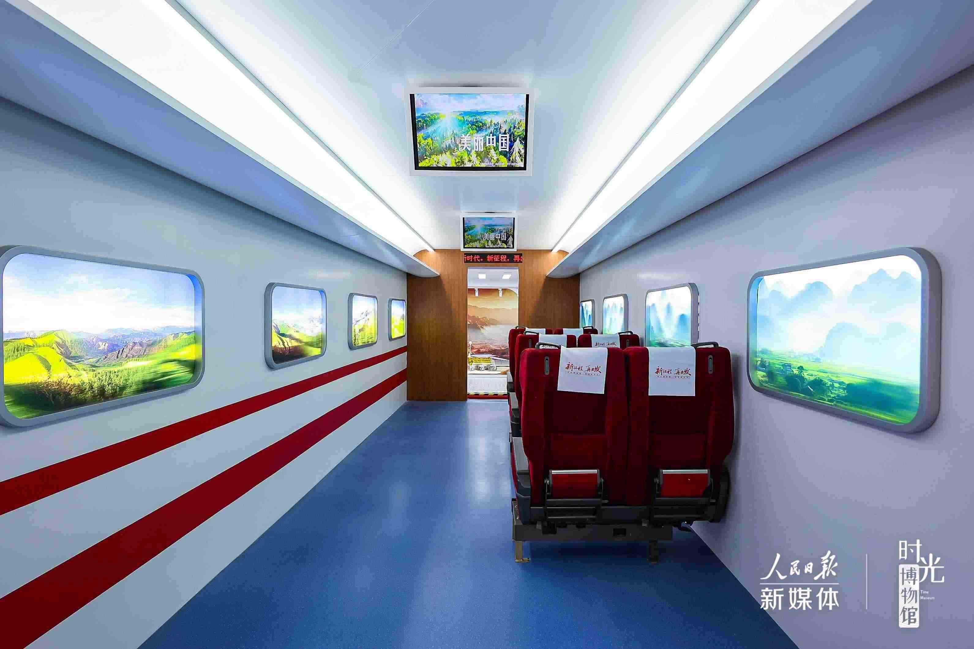 走進(jìn)這座由兩輛雙層雙擴(kuò)容特裝巨型箱體車改裝的“紅房子”里,“復(fù)興號(hào)”高鐵、“天宮”空間站、古今融合的《新千里江山圖》一一映入眼簾。可涂裝的盾構(gòu)機(jī)、可云游的長(zhǎng)城、AR觀影……“實(shí)物+影像+互動(dòng)體驗(yàn)”組成的展區(qū),呈現(xiàn)著新時(shí)代十年的非凡成就。