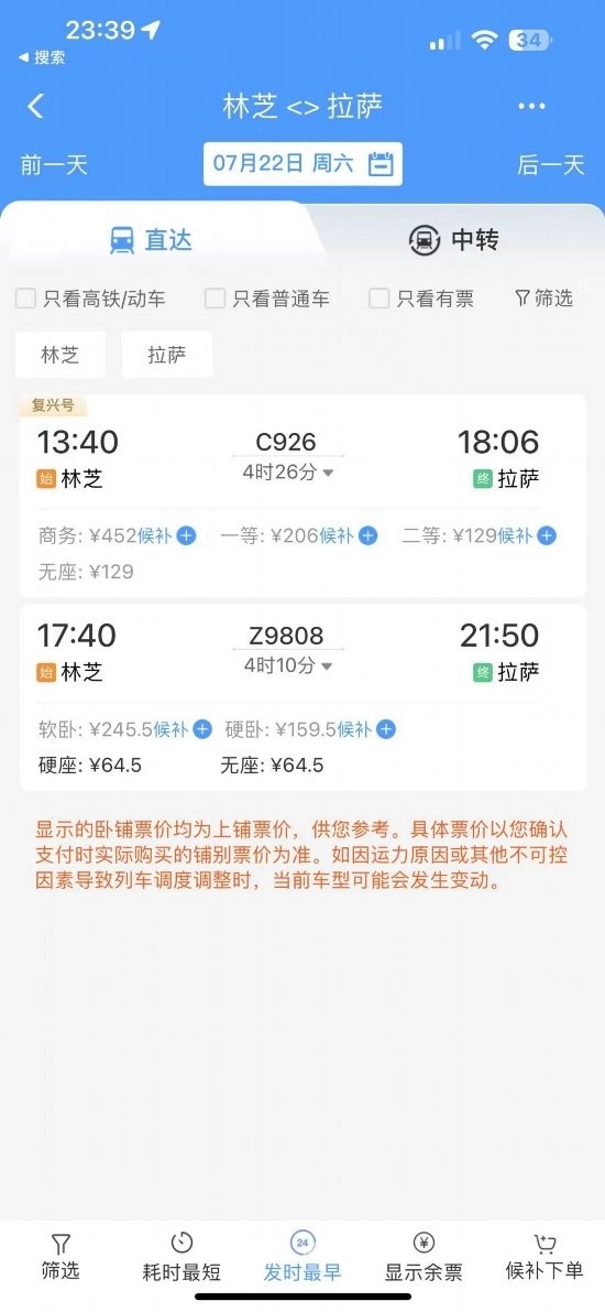 通過在鐵路售票APP上查詢發(fā)現(xiàn),從林芝開往拉薩的復(fù)興號城際列車的二等座票價為129元,直達特快列車硬座為64.5元?!跋啾容^原先180元的客運汽車票價,直達特快列車便宜了近乎三分之一。”曹先生感慨地說道。