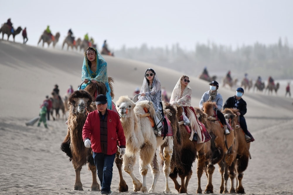 駝隊載著游客行走在鳴沙山月牙泉景區(qū)的駝道上(2023年4月24日攝)。新華社記者 陳斌 攝