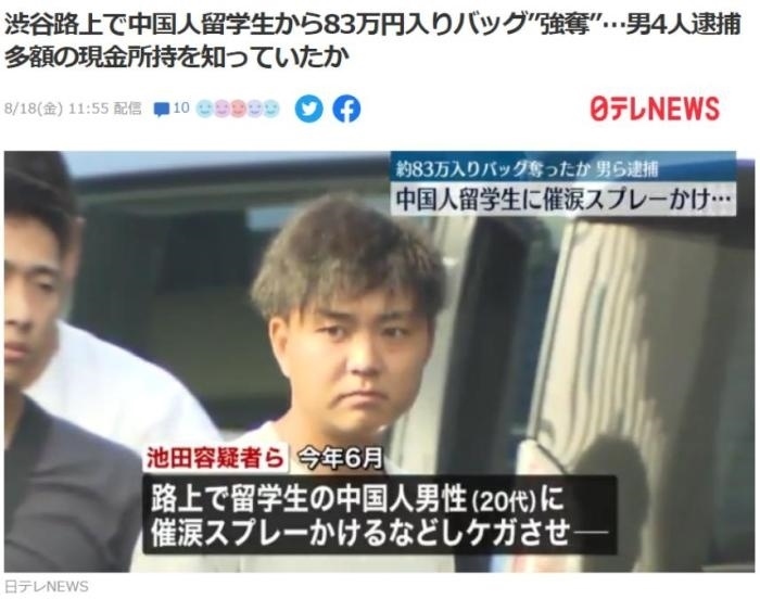 ·在東京搶劫中國留學生的嫌犯落網,搶劫金額超4萬元。
