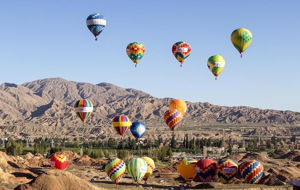 來自全國各地的熱氣球運動員駕乘熱氣球,在甘肅張掖七彩丹霞上空進行飛行表演,上演熱氣球與丹霞的美麗邂逅。