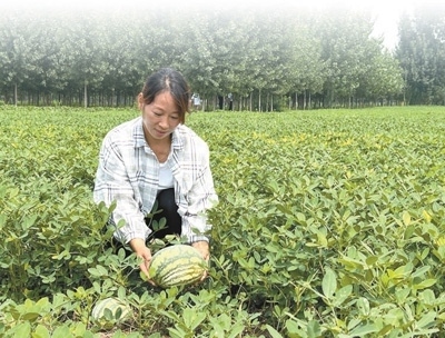 魯小國的妻子肖利萍在西瓜花生套種的地里采摘西瓜。本報(bào)記者 王 者攝