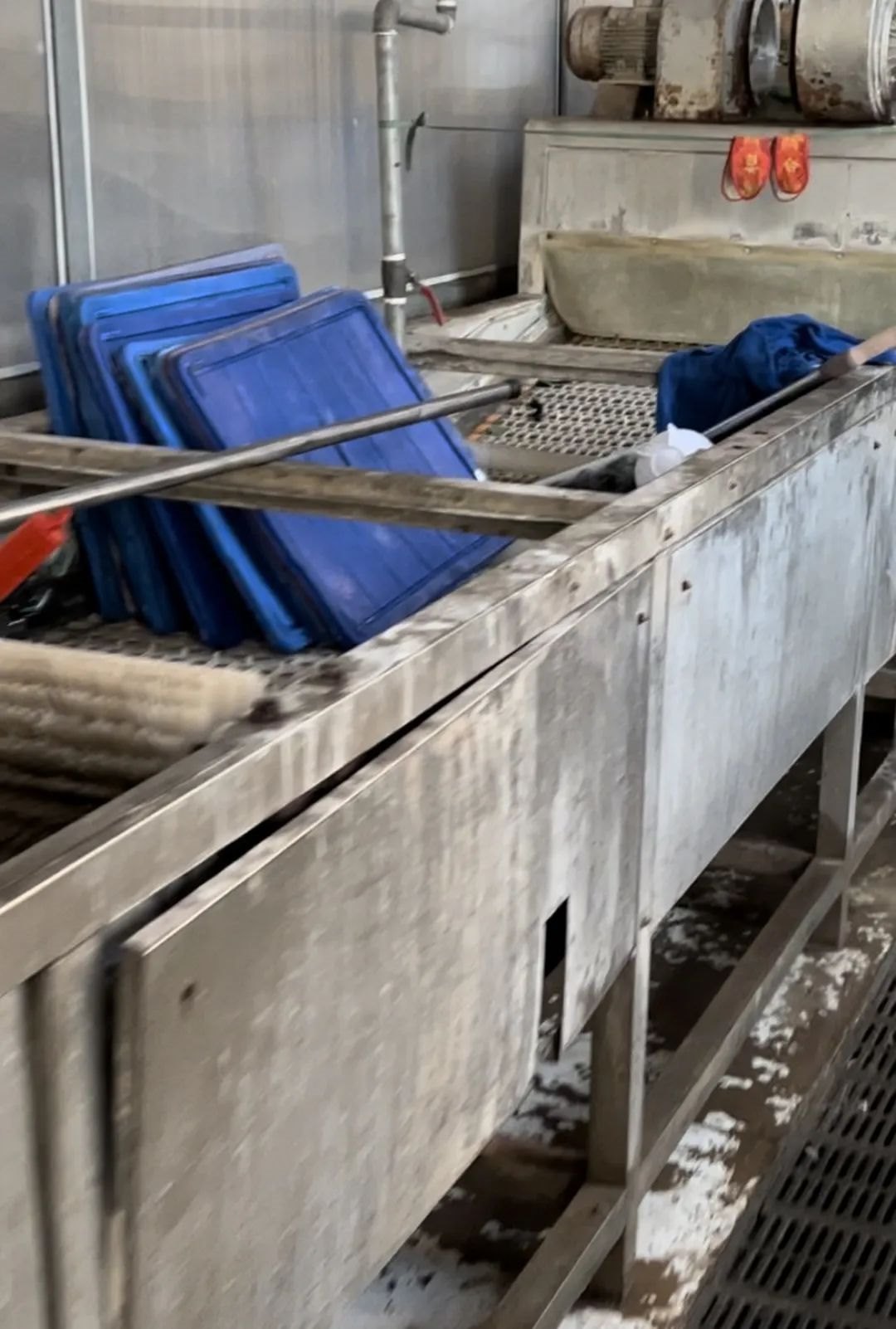 進(jìn)入廠房首先看到的就是一整車餐余垃圾,靠墻放置著多箱已使用后的餐具,地面上存有積水,機(jī)器處于停止?fàn)顟B(tài),工作臺(tái)上留有殘余垃圾,還有鞋墊在上面晾曬。在此期間有多輛小型貨車來(lái)裝卸餐具。