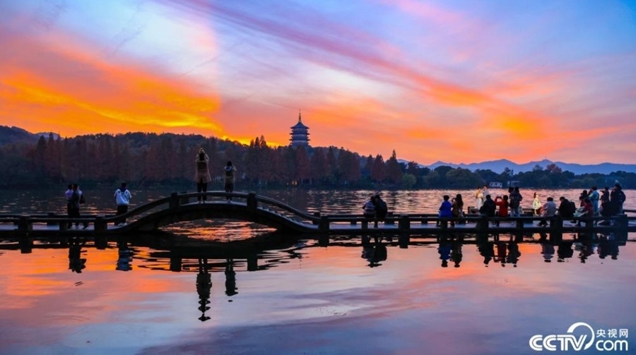夕陽(yáng)西下,在杭州西湖景區(qū),晚霞染紅了天空和水面,與遠(yuǎn)處的雷峰塔構(gòu)成了一幅美麗的畫(huà)卷,吸引游客拍照打卡。