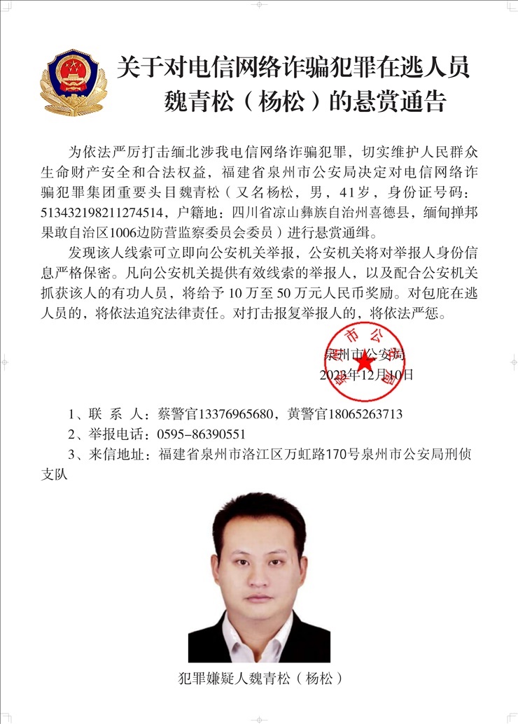 為依法嚴(yán)厲打擊緬北涉我電信網(wǎng)絡(luò)詐騙犯罪,切實(shí)維護(hù)人民群眾生命財(cái)產(chǎn)安全和合法權(quán)益,遼寧省大連市公安局決定對(duì)白所成、白應(yīng)蒼(又名李云晨)、白應(yīng)蘭(又名李夢(mèng)娜)進(jìn)行公開(kāi)懸賞通緝;福建省泉州市公安局決定對(duì)魏懷仁、魏榕(又名陳榕)、魏青松(又名楊松)進(jìn)行公開(kāi)懸賞通緝;福建省龍巖市公安局決定對(duì)劉正祥、劉積光(又名李華光)、劉正茂進(jìn)行公開(kāi)懸賞通緝;重慶市公安局決定對(duì)徐老發(fā)(又名徐發(fā)啟)進(jìn)行公開(kāi)懸賞通緝。