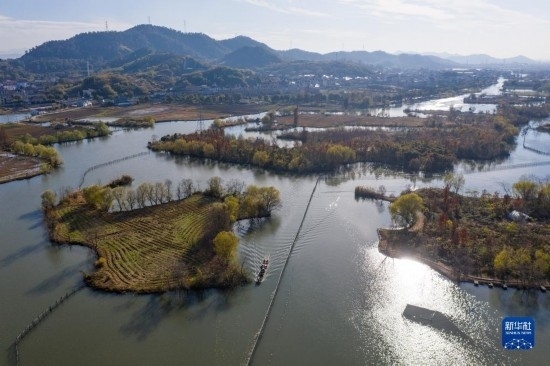 空中俯瞰諸暨市白塔湖國(guó)家濕地公園(無(wú)人機(jī)照片,12月14日攝)。