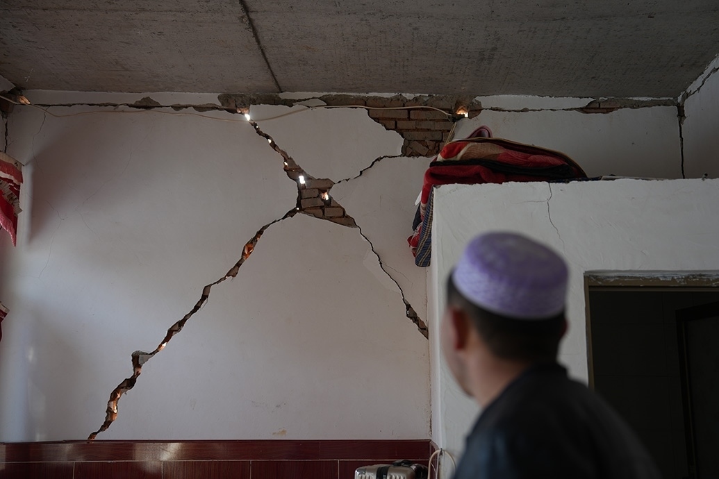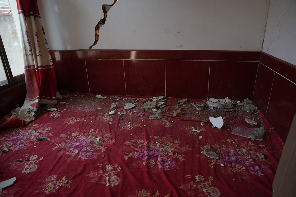 震后,他家木頭架構(gòu)的屋頂傾斜了些,磚瓦墻多處開(kāi)裂,土炕也裂了,柴火的煙從裂縫滲出,有些嗆人。原則上,他家是不能再進(jìn)入了,但上課的話(huà),房間更舒適暖和點(diǎn)。