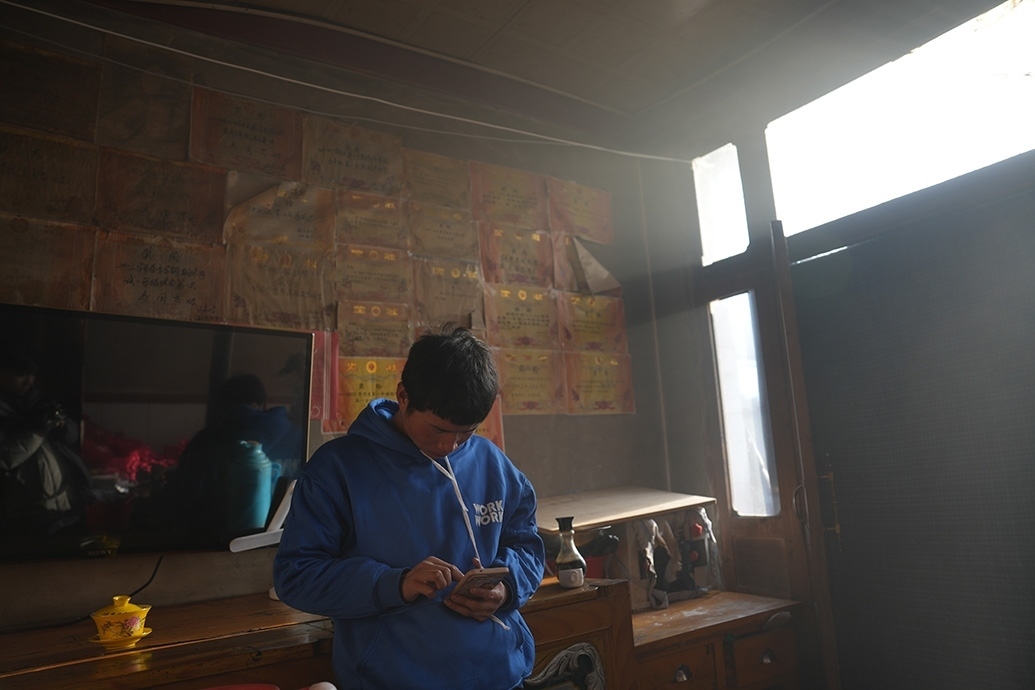 12月23日中午,他坐在炕上,邊聽(tīng)網(wǎng)課邊做筆記,眼神專(zhuān)注,黝黑的臉上透著高原紅,因?yàn)閴毫μ筮€冒了幾顆痘痘。