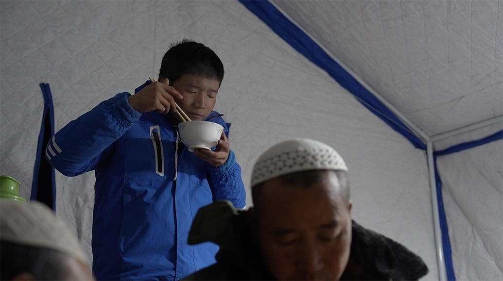 12月20日,馬國(guó)忠一家回到村里,拿塑料布在家附近搭了個(gè)簡(jiǎn)易帳篷,兩根木頭、一條橫梁支起來(lái),怕煙筒把塑料烤化,帳篷里不能烤火,頂多防風(fēng),但馬國(guó)忠覺(jué)得比車(chē)?yán)飶?qiáng)多了。家里的電熱毯拿出來(lái)鋪上,他才睡了個(gè)安穩(wěn)覺(jué)。只是半夜來(lái)了余震,又醒了。他止不住想:下一步怎么辦?后面會(huì)不會(huì)繼續(xù)搖?他家鋼管焊的牛棚頂晃得“乒乒乓乓”響。