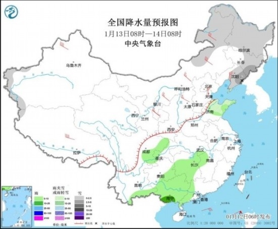1月13日08時至14日08時,新疆南疆西部山區(qū)、內(nèi)蒙古東部、東北地區(qū)大部、山東半島等地的部分地區(qū)有小到中雪或雨夾雪,其中,遼寧東部局地有大雪(5~6毫米)。四川盆地東部、湖南大部、云南東南部、廣西等地的部分地區(qū)有小雨,局地有中雨。內(nèi)蒙古中東部、遼寧、華北北部等地的部分地區(qū)有4~6級風,其中,新疆北部等地的部分地區(qū)有6~7級風。