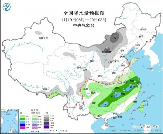 1月19日08時(shí)至20日08時(shí),內(nèi)蒙古中部和東南部、西藏南部、陜西北部、華北西部和北部、黃淮東部、江淮北部、湖北北部、川西高原等地部分地區(qū)有小到中雪或雨夾雪,其中,內(nèi)蒙古中部等地局地有大雪(5~8毫米)。江淮東部和南部、江漢東部、江南、西南地區(qū)東部、華南北部和西部、臺(tái)灣島等地部分地區(qū)有小到中雨,其中,安徽南部、湖南東北部、江西北部、廣西東北部等地局地有大雨(25~45毫米)。遼東半島、山東半島等地部分地區(qū)有4~6級(jí)風(fēng)(見(jiàn)圖3)。