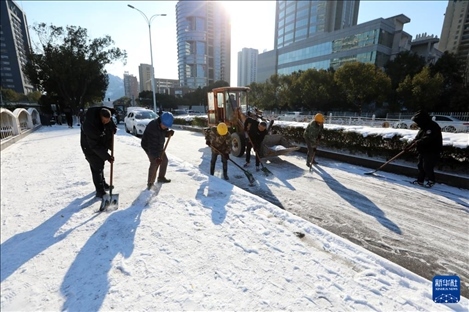 1月23日,在浙江省溫嶺市,人們?cè)谇宄访姹?。近日,受寒潮天氣影響,我國多地迎來降溫降雪天氣,各地積極組織相關(guān)部門開展抗凝除雪工作,保安全保暢通。新華社發(fā)(周學(xué)軍攝)