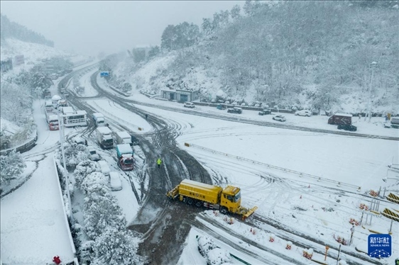 1月22日,在湖南省婁底市一高速收費(fèi)站,除雪車在作業(yè)(無人機(jī)照片)。近日,受寒潮天氣影響,我國多地迎來降溫降雪天氣,各地積極組織相關(guān)部門開展抗凝除雪工作,保安全保暢通。新華社發(fā)(吳永華攝)