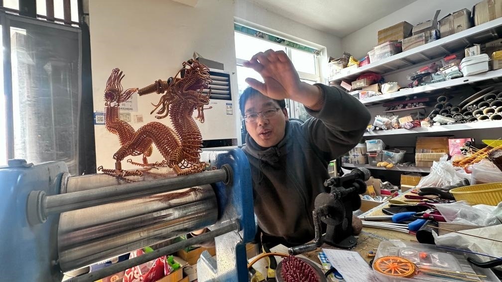 在村民楊訓(xùn)政不大的鋁編工作室內(nèi),簡(jiǎn)易貨架上一排排銅色鋁線編制成的藝術(shù)品讓人目不暇接。一條條鋁制彈簧經(jīng)過(guò)村民巧妙處理后,成了工藝品市場(chǎng)的搶手貨:發(fā)財(cái)樹(shù)、恐龍、摩托車(chē)、機(jī)器人……“我這鋁編雖然產(chǎn)量低、規(guī)模小,訂單可已經(jīng)排到了今年10月底。龍年將至,來(lái)自海內(nèi)外的訂單讓大家年前忙得不亦樂(lè)乎。”楊訓(xùn)政一邊用鉗子擺弄著鋁編小龍,一邊告訴記者。