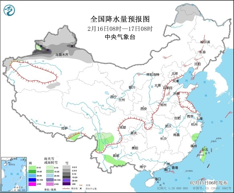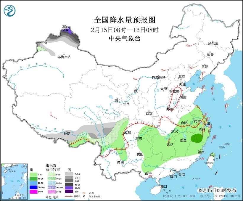 2月15日08時(shí)至16日08時(shí),新疆北部、西藏東部和南部、川西高原中北部等地部分地區(qū)有小到中雪或雨夾雪,其中,新疆阿勒泰地區(qū)有大到暴雪,部分地區(qū)有大暴雪,局地特大暴雪(30~35毫米)。江淮大部、江漢東部、江南、西南地區(qū)東部、華南西部等地部分地區(qū)有小到中雨。西藏中部、內(nèi)蒙古大部、遼寧西部、遼東半島、山東半島、江蘇南部、上海、湖南中北部等地部分地區(qū)有4~6級(jí)風(fēng),其中,浙江中東部部分地區(qū)有6~7級(jí)風(fēng);黃海大部海域、東海大部海域、臺(tái)灣海峽有7~8級(jí)、陣風(fēng)9級(jí)的大風(fēng)(見(jiàn)圖3)。