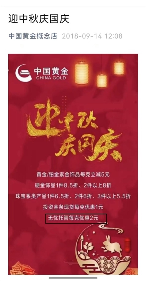 2018年,涉事門店的公眾號仍在宣傳無憂托管業(yè)務,消費者質(zhì)疑中國黃金方面,為何沒有發(fā)現(xiàn)這家店經(jīng)營公司禁止的業(yè)務/受訪者供圖