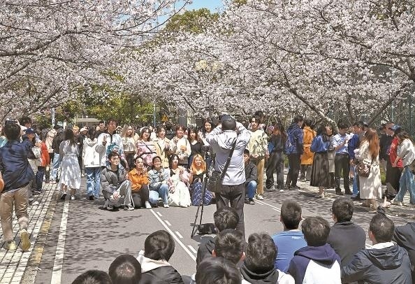 同濟(jì)大學(xué)櫻花園里賞櫻拍照的游人如織