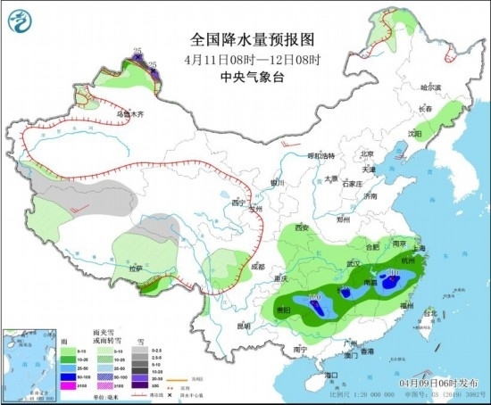 4月11日08時至12日08時,新疆北疆北部、內(nèi)蒙古東北部、黑龍江西北部、西藏西部和中北部、青海南部、川西高原等地部分地區(qū)有小到中雪或雨夾雪,其中,新疆北疆北部高海拔地區(qū)有大到暴雪,局地大暴雪(20~25毫米)。貴州東部、廣西北部、江南大部的部分地區(qū)有中到大雨,其中,湖南東部和西南部、廣西北部、江西東北部、浙江西南部、福建西北部等地部分地區(qū)有暴雨或大暴雨(100~120毫米)。內(nèi)蒙古西北部、西藏西部等地部分地區(qū)有4~5級風(fēng)。
