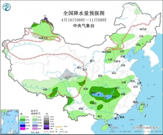 4月9日08時至10日08時,內(nèi)蒙古東北部、黑龍江西北部、新疆北疆北部和伊犁河谷、西藏北部和西部、青海中部和北部、川西高原北部等地部分地區(qū)有小到中雪或雨夾雪,其中,新疆北疆北部等地局部有大到暴雪(10~18毫米)。新疆北部、內(nèi)蒙古中部、華北北部、西藏中部和東南部、青海東部、甘肅中部和南部、寧夏、陜西北部和西南部、四川盆地大部、重慶、湖北西部、貴州北部、湖南北部、云南西部和東南部、廣西東南部、海南島、臺灣島等地部分地區(qū)有小到中雨,其中,西藏東南部局地有大雨(25~30毫米)。新疆北疆沿天山地區(qū)、甘肅西部、內(nèi)蒙古西北部、黑龍江東北部、西藏中部等地部分地區(qū)有4~6級風(fēng)。東海大部海域、臺灣海峽、臺灣以東洋面、巴士海峽、南海東北部海域?qū)⒂?~7級、陣風(fēng)8級的風(fēng),其中臺灣海峽的部分海域風(fēng)力可達(dá)8級、陣風(fēng)9級。