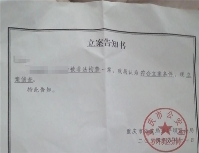 事發(fā)后,家屬向當?shù)嘏沙鏊鶊蟀浮M跸壬鍪镜牧父嬷獣@示,5月11日,重慶市公安局沙坪壩區(qū)分局對前文中的夫妻倆被非法拘禁一案立案偵查。