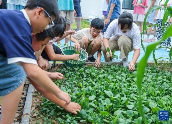 9月10日,東林小學(xué)的學(xué)生在學(xué)校菜園采收青菜。