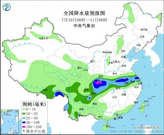 全國降水量預報圖(7月10日08時-11日08時)