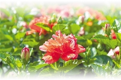朱槿花大色艷,花蕊細(xì)長(zhǎng)伸出于花瓣之外,花柱五裂,柱頭如粉球,花形俏麗喜慶,在我國兩廣地區(qū)被稱為“大紅花”,深受人們喜愛。在南寧,常見的朱槿花有十幾個(gè)品種,既有獨(dú)株高兩三米的小喬木、適合密植為樹籬的灌木,也有適合庭院、窗臺(tái)精巧布置的盆栽。