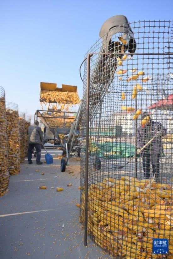 11月13日,在黑龍江省肇東市一處秋糧晾曬場,海城雙麗現(xiàn)代農機專業(yè)合作社的農民在堆放玉米。