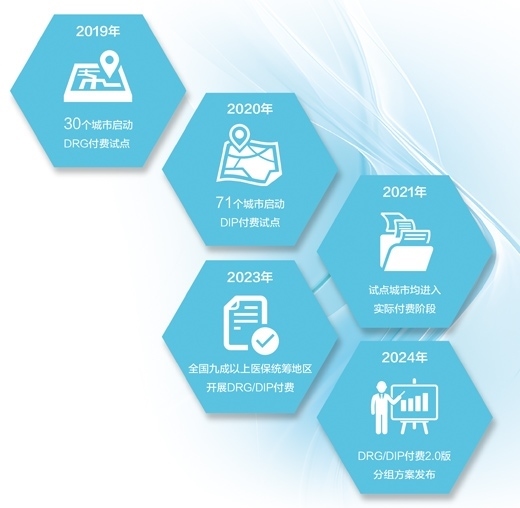 2019年,國家醫(yī)療保障局在武漢、湘潭等30個城市啟動按病組付費試點;次年,在廈門等71個城市啟動按病種分值付費試點。2021年,試點城市均進入實際付費階段。