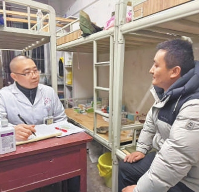 2月8日晚,在筠連縣第二中學(xué)校安置點,筠連縣中醫(yī)院的醫(yī)生正在了解安置群眾身體情況。