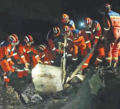 2月8日晚,在筠連縣山體滑坡現(xiàn)場,消防救援人員進行搜救。