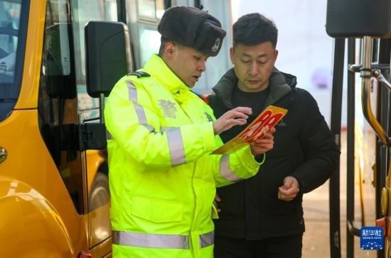 2月14日,烏魯木齊市公安局交警支隊水磨溝區(qū)大隊民警檢查校車通行證。