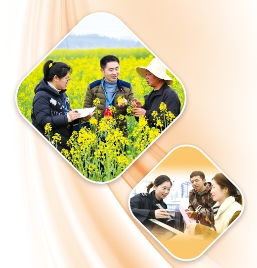 上圖:江西省上高縣錦江鎮(zhèn)團(tuán)結(jié)村油菜花種植基地中,黨員干部(左、中)正在了解春耕情況。