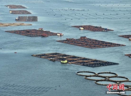 5月2日,福建福州福清市沙埔鎮(zhèn)養(yǎng)殖海域,養(yǎng)殖網(wǎng)箱漂浮在海面上,海上風(fēng)車依次排開,蔚為壯觀。(無人機(jī)照片)