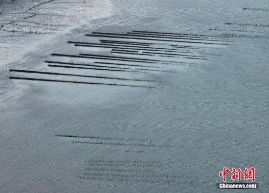 5月2日,福建福州福清市沙埔鎮(zhèn)養(yǎng)殖海域,退潮后灘涂猶如一幅天然的水墨畫卷。(無人機(jī)照片)