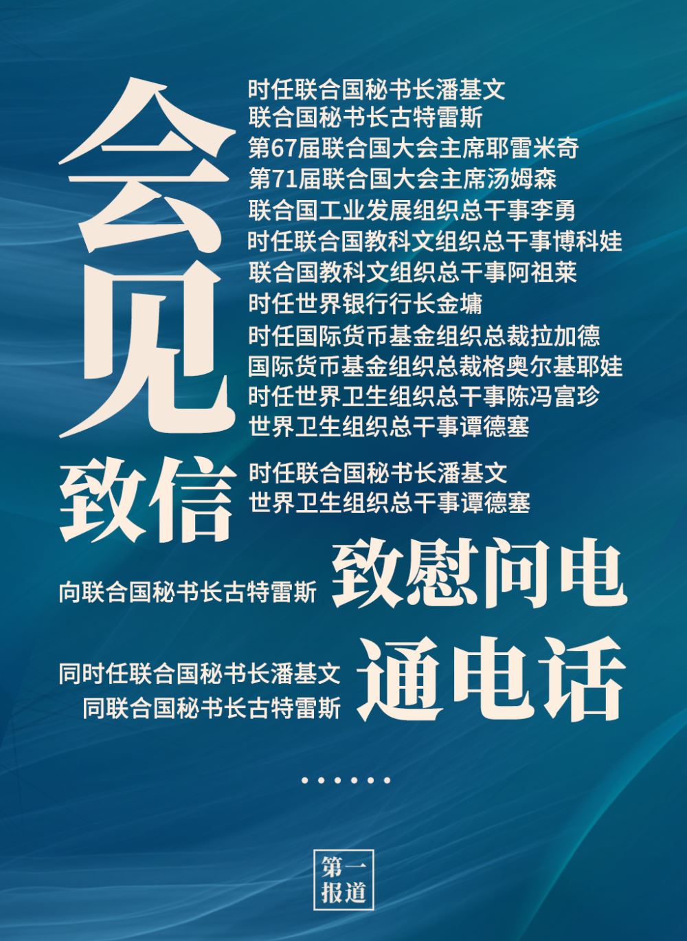 2013年以來,習主席通過會見、通話、致信函等多種方式同聯(lián)合國主要官員保持密切溝通?;訉ο蟀?lián)合國秘書長、聯(lián)合國大會主席,還有聯(lián)合國工業(yè)發(fā)展組織、聯(lián)合國教科文組織、世界銀行、國際貨幣基金組織、世界衛(wèi)生組織等聯(lián)合國專門機構(gòu)主要負責人。