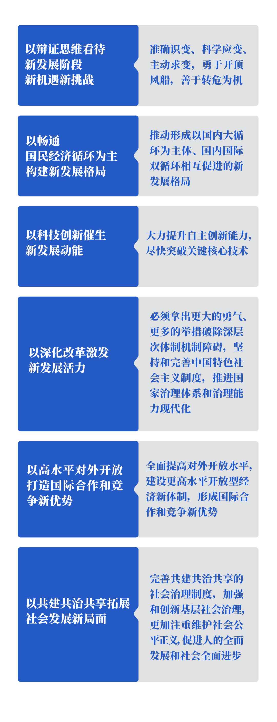 在經(jīng)濟(jì)社會領(lǐng)域?qū)<易剷?,?xí)近平從黨和國家事業(yè)發(fā)展的戰(zhàn)略全局出發(fā),從新發(fā)展階段、新發(fā)展格局、新發(fā)展動能、新發(fā)展活力、國際合作和競爭新優(yōu)勢、社會發(fā)展新局面等方面提出要求。這六點(diǎn)要求為正確認(rèn)識和把握中長期經(jīng)濟(jì)社會發(fā)展重大問題指明了方向,是“十四五”規(guī)劃編制和未來經(jīng)濟(jì)社會發(fā)展的重要遵循。