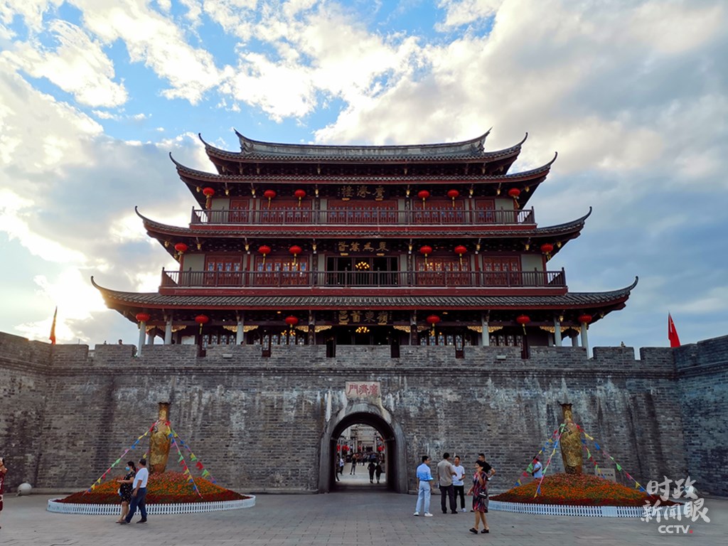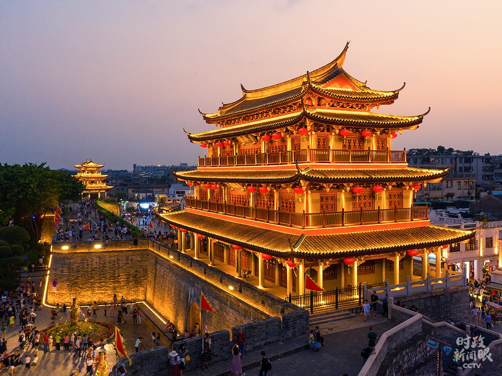 △修復(fù)后的廣濟(jì)門城樓高24.5米,城樓上的“東為萬春”和“嶺東首邑”分別由國際漢學(xué)大師饒宗頤、書法家劉炳森題寫。(總臺央視記者楊立峰拍攝)