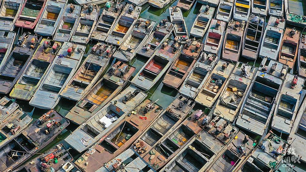 △國(guó)家實(shí)施長(zhǎng)江流域禁捕退捕政策后,江蘇宿遷泗洪縣啟動(dòng)洪澤湖水域禁捕退捕和住家船整治工作。這是聚集在漁港等待拆解的漁船。
