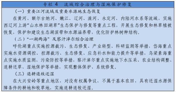 大力推進(jìn)黃河生態(tài)帶建設(shè),統(tǒng)籌水環(huán)境、水生態(tài)、水資源、水安全、水文化,推進(jìn)干支流一體化治理,突出抓好十大孔兌、多沙粗砂區(qū)集中來源區(qū)等水土保持治理,實施河道和灘區(qū)綜合提升治理工程,完善水沙調(diào)控機(jī)制。深化“一湖兩?!奔安旌鼓谞柹鷳B(tài)環(huán)境綜合治理,創(chuàng)新區(qū)域系統(tǒng)治理和流域整體治理舉措,逐步改善生態(tài)環(huán)境。全面加強(qiáng)嫩江、遼河、內(nèi)陸河水系等流域和達(dá)里諾爾、烏拉蓋等濕地生態(tài)保護(hù)修復(fù),深入開展地下水超采綜合治理。