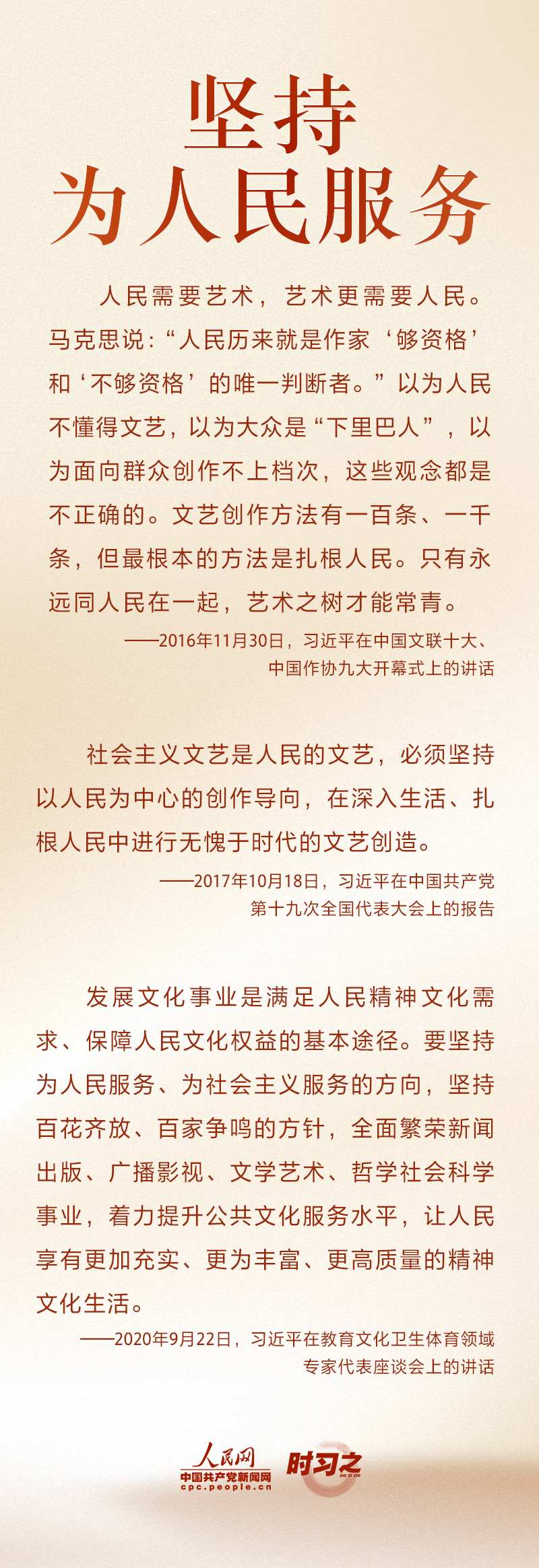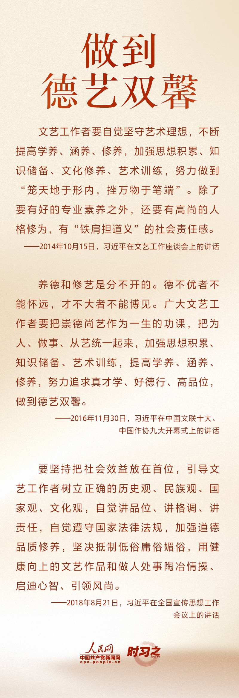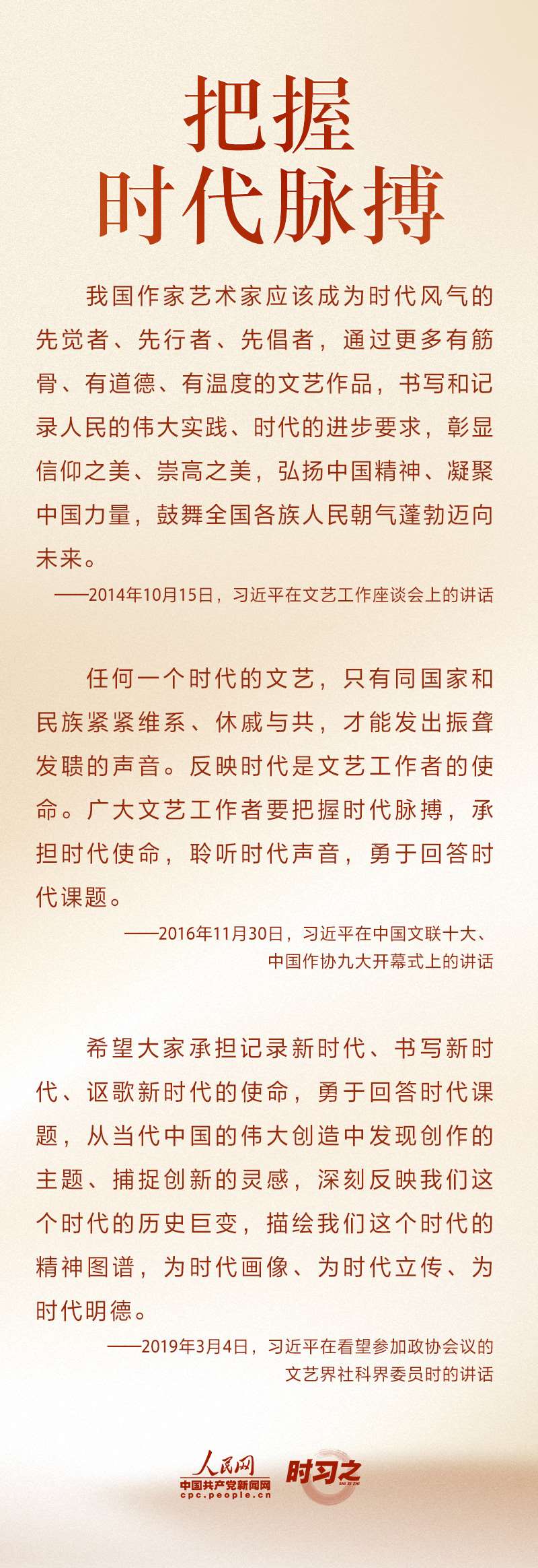 文運(yùn)同國運(yùn)相牽,文脈同國脈相連。新時代文藝工作者承擔(dān)著記錄新時代、書寫新時代、謳歌新時代的重大使命?!拔乃囀氰T造靈魂的工程,文藝工作者是靈魂的工程師?!秉h的十八大以來,習(xí)近平不斷激勵文藝工作者不辜負(fù)時代召喚、不辜負(fù)人民期待,以德服人、以文化人。